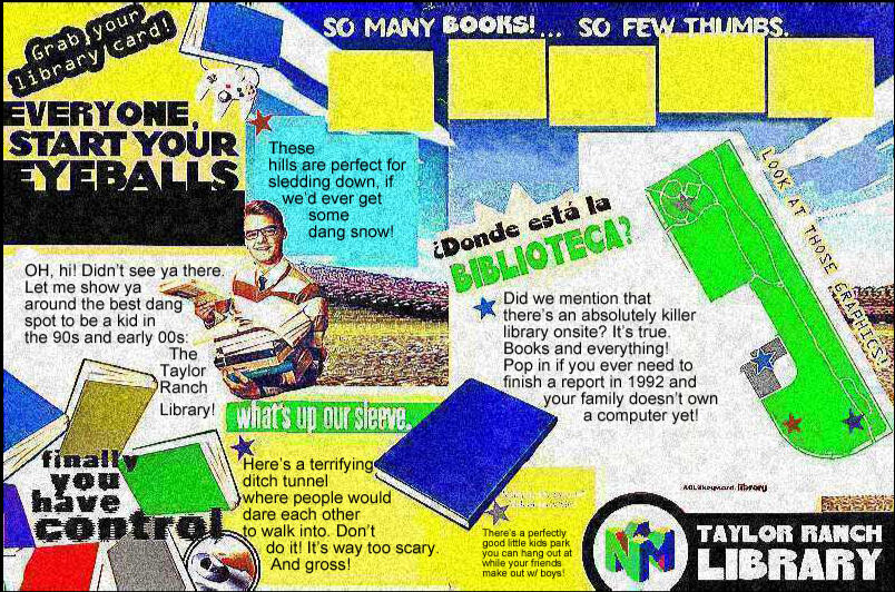 Part personal narrative, part deep-fried meme, The Taylor Ranch Library map is a big dose of 90s/00s nostalgia on a printed page.Drawing from her experience living near a landmark in her neighborhood, Sarah Kennedy has adapted a vintage video game console ad to playfully takes you on a tour around all of the most radical and tubular sites of a library on Albuquerque's westside.After visiting Sarah's version of the Taylor Ranch Library, you too will know all the killer spots to go sledding and dare friends to spelunk in a tunnel.